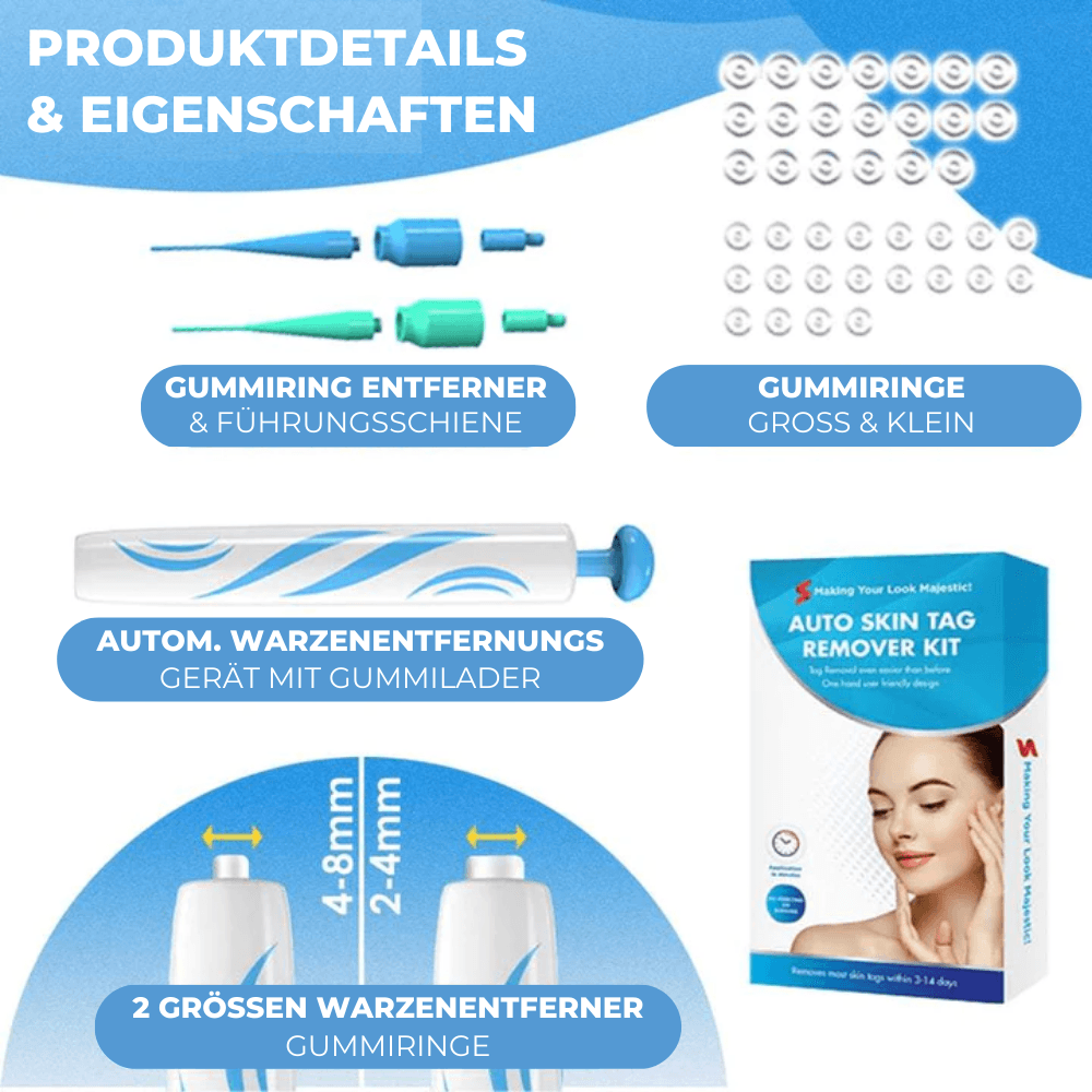 BandAway™ ist ein komplettes Entfernungs-Set mit Präzisionswerkzeugen und 40 elastischen Bändern in 2 Größen (2-4mm & 4-8mm) für kleine und große Hautanhängsel überall am Körper.